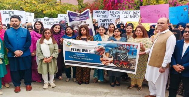 وومن یونیورسٹی راولپنڈی میں سانحہ جعفر ایکسپریس کے متاثرین سے اظہار یکجہتی کے لیے امن واک کا انعقاد کیا گیا۔ واک میں مختلف شعبہ جات سے تعلق رکھنے والے اساتذہ اور طلبہ کی بڑی تعداد نے شرکت کی۔ ذرائع کے مزید پڑھیں