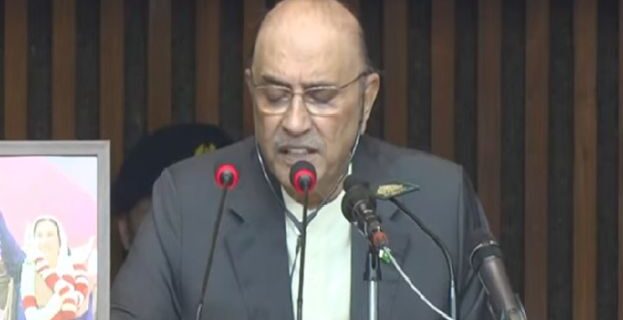 پارلیمنٹ کے مشترکہ اجلاس سے خطاب کرتے ہوئے صدر مملکت آصف علی زرداری نے کہا ہے کہ پاکستان کسی بھی ملکی یا غیر ملکی کو اپنے امن کو غیر مستحکم کرنے کے لیے کسی پڑوسی ملک کی سرزمین استعمال کرنے کی اجازت نہیں دے گا۔ ان کا کہنا تھا کہ پارلیمنٹ کی بالادستی پر میرا ایمان صرف الفاظ تک محدود… انہوں نے کہا کہ یہ منفرد اعزاز ہے کہ بطور دوبار منتخب صدرمملکت پارلیمنٹ سے یہ میرا 9واں خطاب ہے، پارلیمنٹ سے ایسا ہر خطاب جمہوری نظام کے تسلسل اور ذمہ داری کی یاد دہانی ہے۔ انہوں نے کہا کہ قوموں کا امتحان صرف بحران میں نہیں، اہم موڑ پر بھی ہوتا ہے، جمہوریہ کی طاقت آئین، عوامی ثابت قدمی، پارلیمنٹ اور حکومت کی ذمہ داری، مسلح افواج کے حوصلے میں مضمر ہے، نئے پارلیمانی سال کے آغاز پر ہمیں اسی عزم کو آگے بڑھانا ہے، ملکی خودمختاری کا تحفظ، آئین کی حکمرانی اور معاشی ترقی کو فروغ دینا ہے۔ انہوں نے کہا کہ اپنے شہریوں کی خوشحالی اور امن کیلئے ترقی اور استحکام کا عمل آگے بڑھانا ہے، آج ہم اُن بنیادوں پر کھڑے ہیں جو ہماری قومی جدوجہد کے معماروں نے رکھی تھیں، قائدِاعظم نے ایسی جمہوری ریاست کا تصور پیش کیا جو آئین اور قانون کی حکمرانی پر قائم ہو، شہید ذوالفقار علی بھٹو نے قوم کو متفقہ آئین دیا، بے، نظیر بھٹو شہید نے قربانی اور مثالی قیادت سے جمہوری عمل کو مضبوط کیا۔ ان کا کہنا تھا کہ پارلیمنٹ کی بالادستی پر میرا ایمان صرف الفاظ تک محدود نہیں، گزشتہ دور میں یکطرفہ طور پر صدارتی اختیارات پارلیمنٹ کو واپس کیے، تاریخی 18ویں ترمیم کے ذریعے صدر مملکت کا منصب وفاق کی وحدت کی علامت ہے۔ گزشتہ دس ماہ میں ہماری قوم نے پیچیدہ چیلنجز کا سامنا کیا، دونوں سرحدوں پر بلااشتعال حملوں پر ہماری افواج نے غیر معمولی پیشہ ورانہ مہارت اور نظم و ضبط کا ثبوت دیا، ہماری بہادر افواج نے معرکۂ حق میں بھارتی حملے کو تاریخی تذویراتی فتح میں بدل دیا، 26 فروری کی رات طالبان رجیم نے مغربی سرحد پر حملے کیے۔ سیاسی قیادت متحد اور قوم ثابت قدم رہی، بھارتی جارحیت کا مقابلہ کرتے ہوئے عسکری اور سفارتی محاذوں پر کامیاب رہے، عالمی برادری نے ہماری اصولی اور فیصلہ کن کارروائی کو تسلیم کیا، مقبوضہ جموں و کشمیر کے عوام کی منصفانہ جدوجہد کی سفارتی اور اخلاقی حمایت جاری رکھیں گے، بھارتی قبضے سے کشمیر کی آزادی تک جنوبی ایشیا محفوظ نہیں ہوسکتا، پاکستان ایک ذمہ دار ایٹمی ریاست ہے۔ اقوام متحدہ کے چارٹر کا آرٹیکل 51 ہمیں اپنی خودمختاری کا دفاع کرنے کا حق دیتا ہے، سرحد پار دہشت گردی کے خلاف پوری قوم اپنی مسلح افواج کے شانہ بشانہ ہے، افغانستان سے دہشت گردوں کی دراندازی روکنے کیلئے سفارت کاری کی ہر ممکن کوشش کی۔ انہوں نے ایران کے ساتھ مذاکرات کے دوران چھیڑی جانے والی جنگ کی شدید مذمت کی، خطے کو مزید بحران سے بچانے کیلئے امن، تحمل اور مذاکراتی حل پر زور دیا اور کہا کہ پاکستان اور امریکا میں اسٹریٹجک تعاون اور شراکت داری کی نئی راہیں کھلی ہیں، پاکستان اور چین کے تعلقات نئی بلندیوں پر پہنچے ہیں۔ سی پیک 2 پاکستان کے بنیادی ڈھانچے میں انقلاب برپا کرے گا، شی جن پنگ کا شکر گزار ہوں، مسئلہ فلسطین پر پاکستان اصولی موقف رکھتا ہے، 1967 سے پہلے کی سرحدوں کے مطابق آزاد فلسطینی ریاست کی حمایت، سندھ طاس معاہدے کو التوا میں ڈالنے کے غیر قانونی بھارتی اقدامات آبی دہشتگردی ہیں، منتخب صدر کی حیثیت سے وفاق اور پارلیمنٹ کے اتحاد کی حفاظت کا پابند ہوں، بلوچستان کی محرومیوں پر خصوصی توجہ ناگزیر ہے۔ معاشی استحکام اور قومی سلامتی لازم و ملزوم ہیں، ادارہ جاتی اصلاحات انتہائی ضروری ہیں، ٹیکس نظام اور اخراجات میں شفافیت اعتماد کی بنیاد ہے، ٹیکنالوجی اور جدت عالمی معیشت کو نئی شکل دے رہی ہے۔ پاکستان کلین انرجی کے شعبے میں پیچھے رہنے کا متحمل نہیں ہو سکتا، سماجی تحفظ کے فریم ورک بی آئی ایس پی کے ذریعے پسماندہ طبقوں کو بااختیار بنانا ہے، سلامتی، معیشت اور آئینی طرز حکمرانی ایک دوسرے سے منسلک ہیں، آئیں آزما